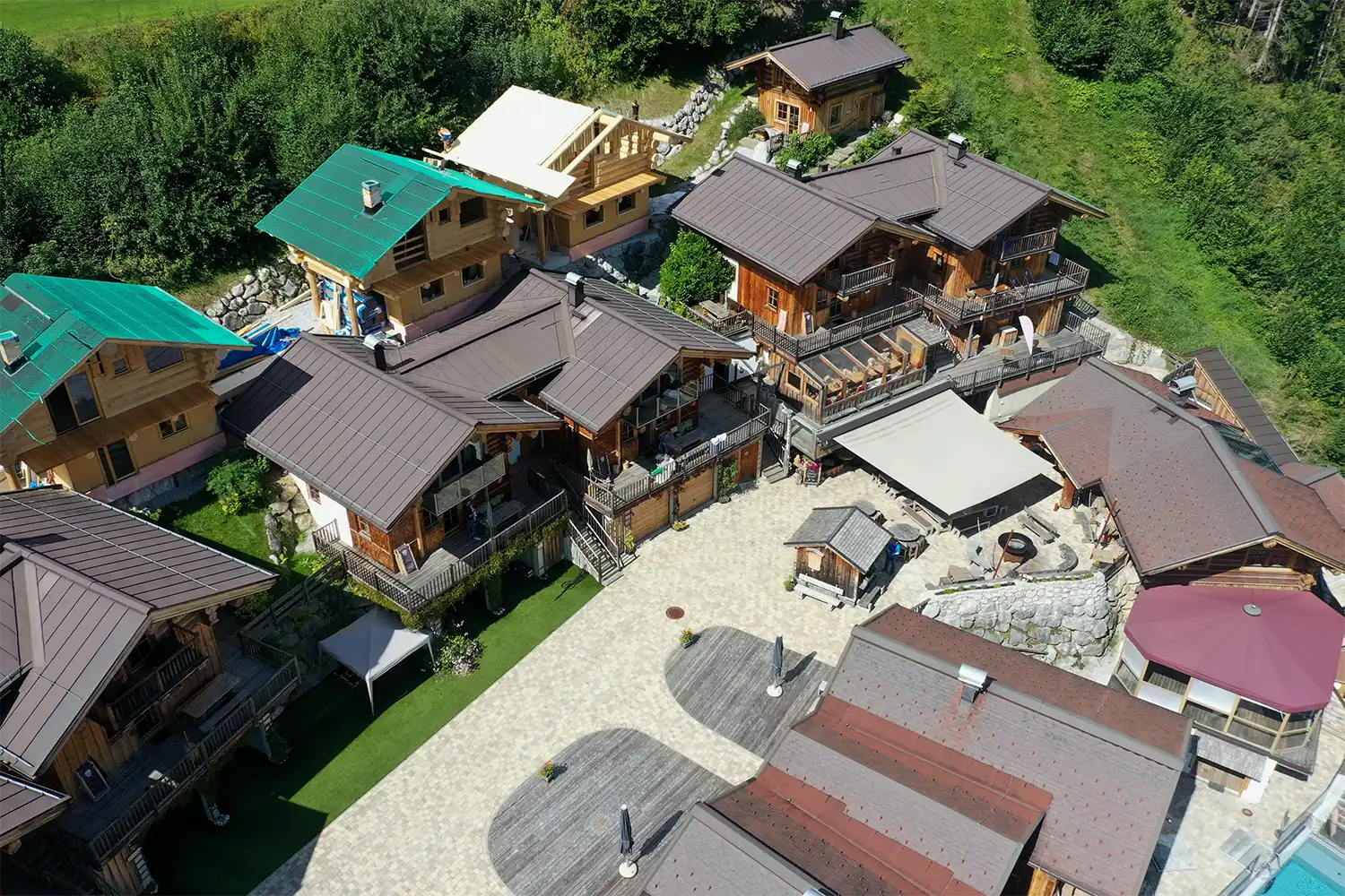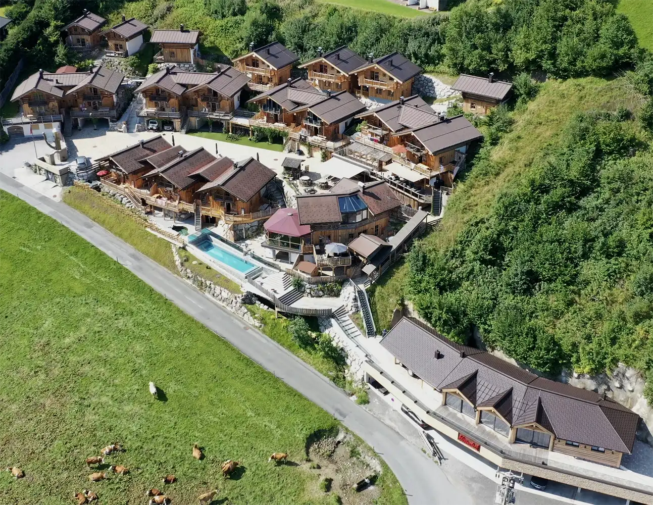 Holzchalets in Hanglage mit Pool, umgeben von Grünflächen und Steinterrassen.